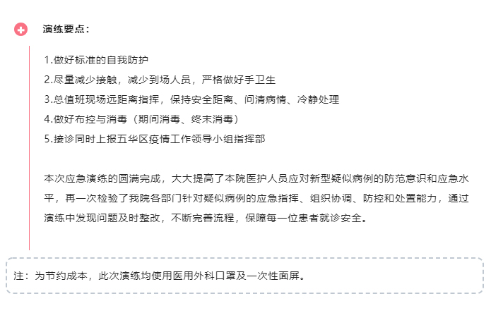 在此次应急演练中,张红常务副院长对各部门给予充分肯定,在演练结束后总结点评,就每一环节进行及时纠正,并对未来应急处置工作提出相关要求和部署。她强调要加强各部门应对紧急情况的联动机制,将疫情防控应急处置常态化,不断提高应急团队的实战能力,将疫情防控应急处置做成常态化,并做到“应答及时、跟踪及时、处理及时、消毒及时、上报及时”。